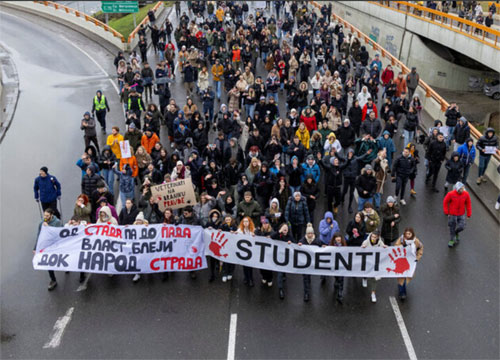 في الأول من تشرين الثاني 2024، انهار سقف محطة قطار مدينة نوفي ساد شمال صربيا، التي تم ترميمها حديثًا. لقد أدى انهيار السقف إلى وفاة 15 مواطنا. ومنذ ذلك الحين، اندلعت حركة احتجاجات حاشدة، شكل الطلبة عمودها الفقري، مطالبين بتوضيح ملابسات الحادث، رافضين الفساد الذي ينخر أجهزة الدولة. وفي نهاية الأسبوع الفائت، اندلعت احتجاجات حاشدة مرة أخرى، وتمت محاصرة الجامعات ونظمت إضرابات في العديد منها.