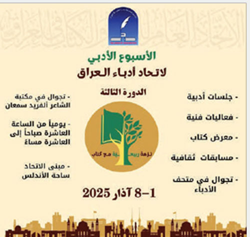 يستعد الاتحاد العام للأدباء والكتاب لتنظيم أسبوعه الأدبي الثالث، الذي تقرر أن تمتد فعالياته من يوم السبت المقبل الأول من آذار حتى اليوم الثامن منه، على قاعات وباحات مقر الاتحاد في بغداد.