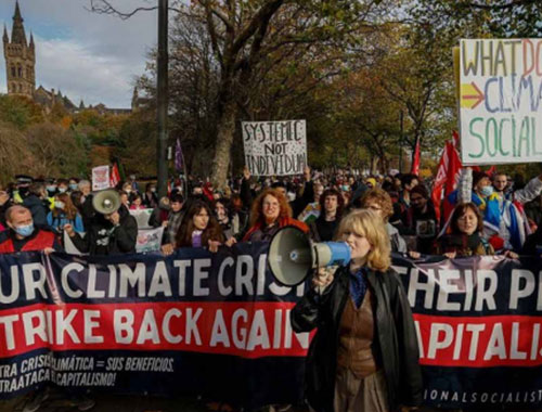 عادة ما تصاحب قمم المناخ بحركة احتجاج واسعة، وقبل انعقاد هذه الدورة، ومع انطلاق اعمالها، استمرت حركة احتجاج شملت 250 مدينة في جميع انحاء العالم، شارك فيها مئات الآلاف للمطالبة بالمزيد من حماية المناخ والعدالة المناخية، ونظمت احتجاجات السبت الفائت، في إطار يوم الاحتجاج العالمي، نزل خلاله أكثر من 100 ألف الى شوارع غلاسكو وحدها. وجاء في نداء التحالف لمواجهة قمة المناخ 26: ان “العدالة لا تمنح من قبل رؤساء الدول أو الحكومات أو الشركات”. و”نحن ننظم تعبئة جماهيرية لامركزية في جميع أنحاء العالم ونجمع الحركات سوية لبناء قوة من أجل تغيير النظام، من نضالات السكان الأصليين (الهنود الحمر) إلى نقابات العمال، ومن المجموعات المناضلة في سبيل العدالة العرقية إلى الشباب المضربين”. لأنه بدون تغيير النظام لن تكون هناك حماية فعالة للمناخ ولن تكون هناك عدالة مناخية.