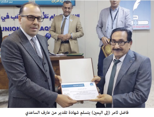 وفي الختام، قدم المستشار الثقافي لرئيس الوزراء وعضو المجلس المركزي للاتحاد د. عارف الساعدي، شهادة تقدير باسم الاتحاد إلى الناقد فاضل ثامر.