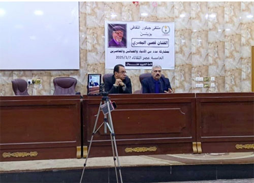 جدير بالذكر، أنه قبل بداية الجلسة وقف الحاضرون وقفتي حداد، الأولى إكراما للفنان قصي البصري، والثانية إكراما للأديبين الراحلين أخيرا الروائي أحمد خلف والشاعر د. عامر السعد.