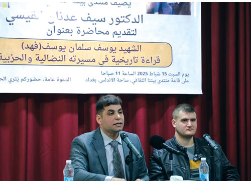 في مناسبة يوم الشهيد الشيوعي العراقي 14 شباط، ضيّف منتدى "بيتنا الثقافي" في بغداد السبت الماضي، د. سيف عدنان القيسي، الذي قدم محاضرة بعنوان "الشهيد يوسف سلمان يوسف (فهد) – قراءة تاريخية في مسيرتيه النضالية والحزبية".