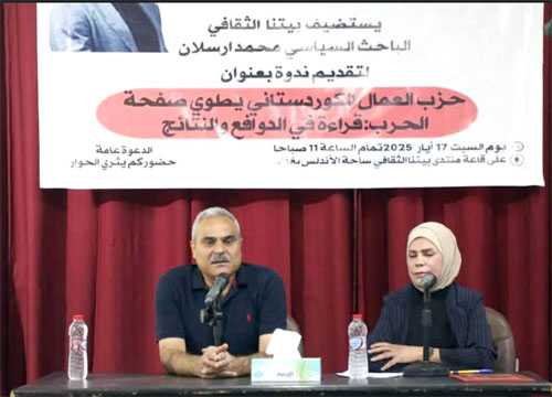 شهد منتدى "بيتنا الثقافي" في بغداد، أخيرا، جلسة حوارية بعنوان "حزب العمال الكردستاني يطوي صفحة الحرب - قراءة في الدوافع والنتائج"، قدم فيها الباحث محمد أرسلان عرضا تحليليا معمقا لخلفيات التحول في موقف الحزب من العمل المسلح إلى النضال السياسي السلمي.