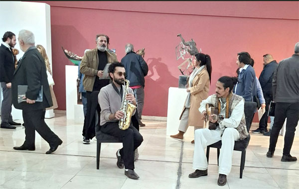 وتصدّر المعرض عمل نحتي للنحات الرائد الراحل اتحاد كريم، تكريما لمكانته الفنية. ووسط تلك الأجواء كانت الموسيقى حاضرة لتجعل المكان بهيجا.