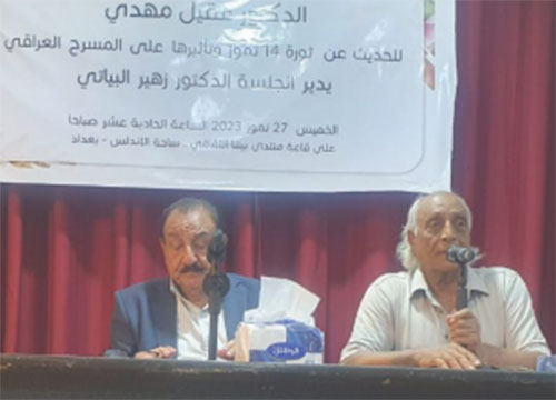 ضيّف منتدى “بيتنا الثقافي” في بغداد، الخميس الماضي، جلسة حول “ثورة 14 تموز وتأثيرها على المسرح العراقي”، ضيّف فيها المسرحي الأكاديمي د. عقيل مهدي، بحضور جمهور من المثقفين والفنانين والإعلاميين.