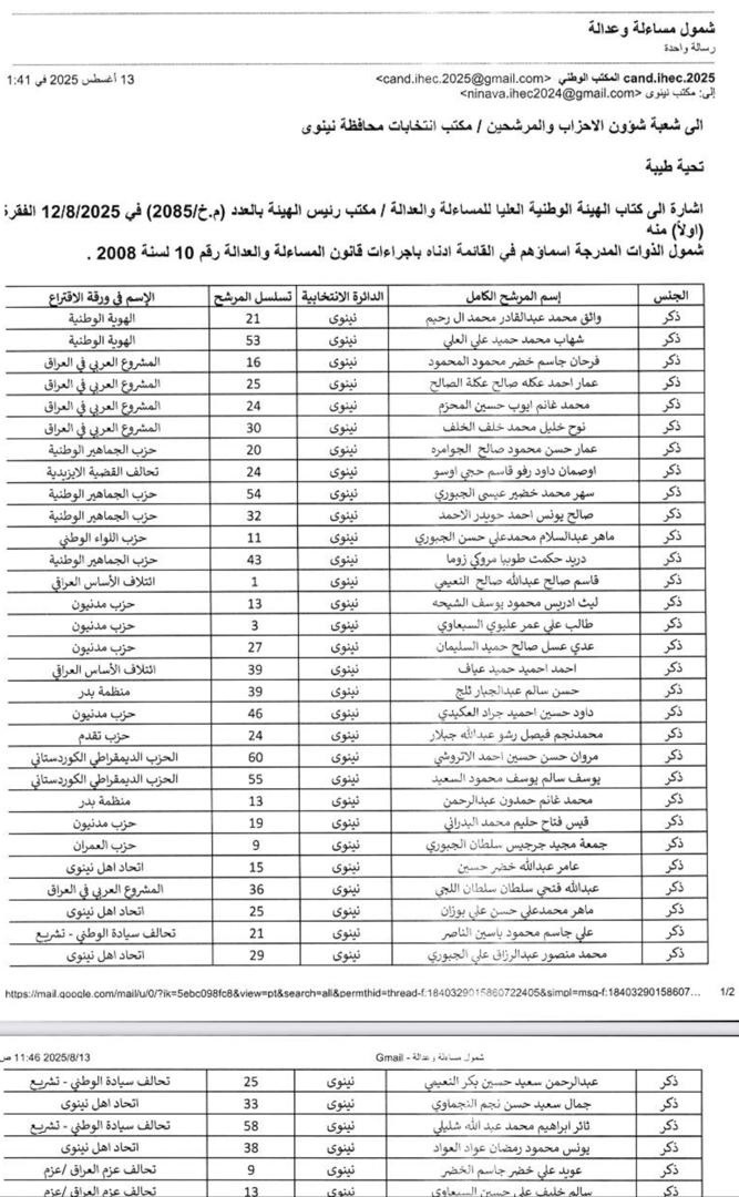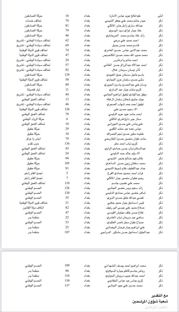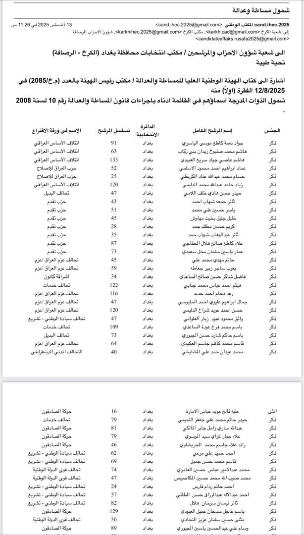 وبحسب الوثائق ادناه الصادرة عن شعبة شؤون المرشحين فإنه "تم شمول أسماء عشرات المرشحين للانتخابات البرلمانية بقانون المساءلة والعدالة من مختلف الأحزاب وفي محافظتي بغداد ونينوى: