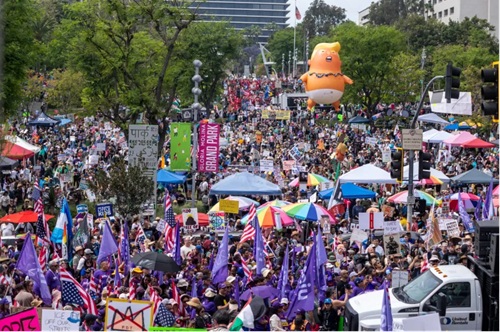 وفي سان دييغو، شارك نحو 40 ألف شخص في تجمع "لا ملوك"، بحسب الشرطة. وفي نيويورك، قالت دونا ليبرمان، المديرة التنفيذية لاتحاد الحريات المدنية في نيويورك، خلال مؤتمر صحفي، إن ترامب وأنصاره يريدون تخويف الناس ومنعهم من الاحتجاج.