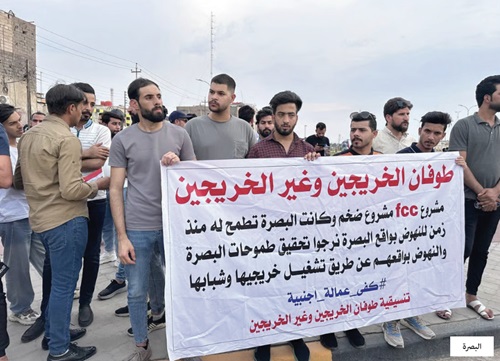 وجدّد عدد من العاطلين عن العمل، وقفتهم الاحتجاجية أمام فلكة البحرية بالبصرة، مطالبين بالتعيين واستبدال العمالة الأجنبية بالمحلية.