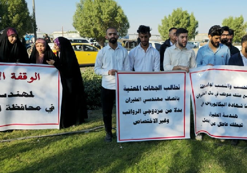 ونظم عدد من المهندسين أمام مطار النجف الدولي، وقفة احتجاجية، الجمعة، عقب الكشف عن وجود رواتب مزدوجة تتقاضاها فئة من موظفي المطار.