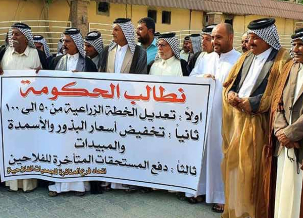 إلى ذلك، نظم فلاحون ومزارعون في قضاء الزبير غربي البصرة وقفة احتجاجية للمطالبة بإعادة الدعم الحكومي وتوفير المستلزمات الزراعية المطلوبة، ومنها سماد الداب واليوريا، فيما بيّن عدد منهم أن وزارة الزراعة قامت بقطع حصة سماد الداب وتخفيض حصة سماد اليوريا ورفع أسعار الأسمدة إلى الضعف.