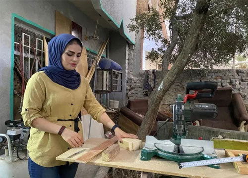 أسست نور الجنابي (29عاما) ورشتها الخاصة بالنجارة في باحة منزلها اولا، وبأدوات بسيطة سعى زوجها الى توفيرها لها قدر الامكان.