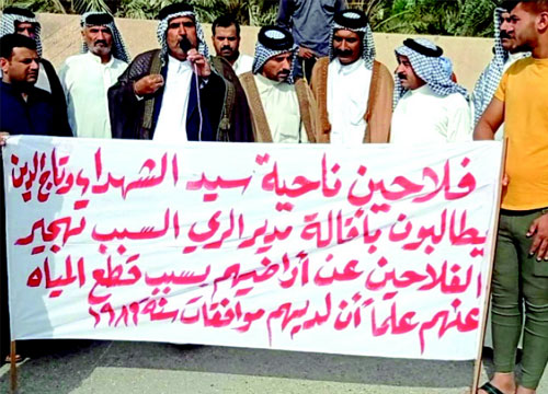 تظاهر العشرات من الفلاحين والمستأجرين في ناحية سيد الشهداء التابعة الى محافظة واسط، يوم الخميس الماضي، احتجاجا على منعهم من تشغيل مضخات المياه لغرض سقي أراضيهم الواقعة على نهر دجلة، وفقا للخطة الزراعية وحسب توجيهات مديرية الزراعة في المحافظة.