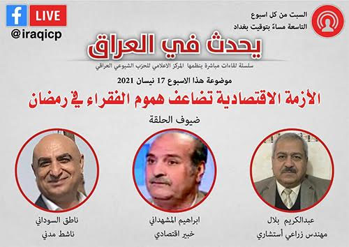 بالتزامن مع الاسبوع الاول من شهر رمضان، وبينما أزمة غلاء الاسعار وسوء الاوضاع الاقتصادية تتفاقم، خصّص المركز الاعلامي للحزب الشيوعي العراقي برنامج “يحدث في العراق” على صفحة الحزب الرسمية في “فيسبوك” حلقة بعنوان: “الازمة الاقتصادية تضاعف هموم الفقراء في رمضان”، ضيّف فيها الخبير الاقتصادي ابراهيم المشهداني، والمهندس الزراعي عبد الكريم بلال، والناشط المدني ناطق السوداني. فيما قدّم لها الاعلامي سيف زهير. “طريق الشعب” تنشر جانباً مما جاء في هذا اللقاء
