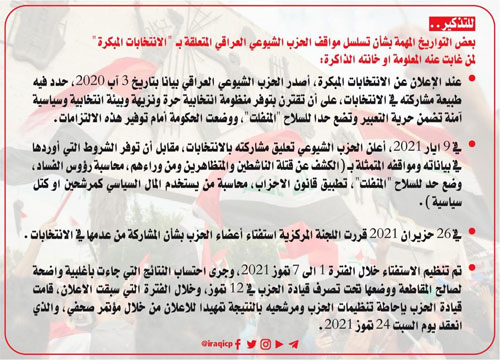 الصحفي والناشط في الاحتجاجات، غضنفر لعيبي، أكد أن “انسحاب الحزب الشيوعي العراقي من الانتخابات، هو بمثابة انسحاب ركن أساسي في العملية السياسية، له تاريخ يتجاوز الثمانين عاما. هذا الانسحاب قد يفقد الانتخابات شرعيتها”.