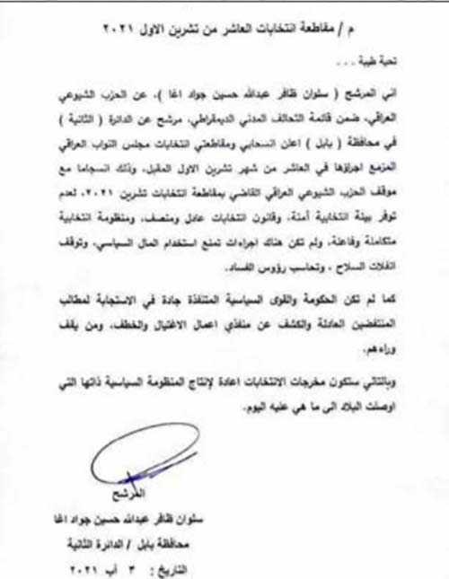 وادراكا وتقديرا لمسؤوليتي تجاه وطني ومن امثلهم وادافع عن حقوقهم ومطالبهم العادلة ، اعلن انسحابي من الترشيح ، وكذلك مقاطعتي لانتخابات تشرين القادم .