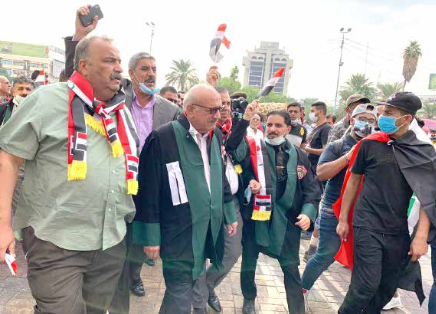 وأوضح أن “نقابة المحامين دائماً ما تقف الى جانب الشعب، وتدافع عن حقوقه الاساسية بالعيش الكريم، وطالبت اثناء الانتفاضة ببناء دولة على اساس المواطنة وحشد امكانيات عراقية، على اساس الكفاءة والنزاهة، لا على اساس توزيع الحقائب الحكومية استنادا للانتماءات الفرعية الاخرى، فضلاً عن العمل بسياسة التطهير، بما يؤمن إبعاد الجهاز الحكومي عن الفساد، وإيقاف سرقة اموال العراق، وتهريبها الى الخارج”.