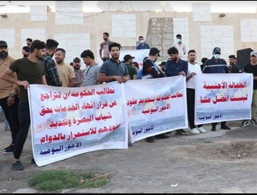 من جانبهم، نظم العشرات من العاملين بصفة أجور يومية في شركة خطوط الأنابيب النفطية، وقفة احتجاجية في ساحة الطيران وسط البصرة، للمطالبة بتجديد عقودهم في الشركة.