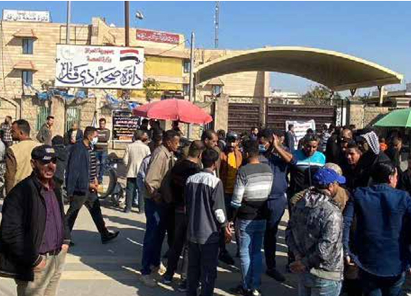 وقال مراسل “طريق الشعب”، ان “العشرات من حملة الشهادات الجامعية المطالبين بفرص عمل، أغلقوا المدخل الرئيس لشركة نفط محافظة ذي قار بالإطارات المحترقة، للمطالبة بتوفير فرص العمل”، مشيرا الى ان “العشرات من اصحاب العقود في دائرة صحة ذي قار، اغلقوا مبنى الدائرة وسط مدينة الناصرية في خطوة تصعيدية، للمطالبة بتفعيل وتطبيق قرار 315 لعقود الصحة وصرف فروقاتهم المالية المتراكمة لضمان رواتبهم للعام المقبل”.