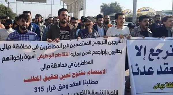 وقال مراسل “طريق الشعب”، ان “العشرات من خريجي كليات التربية من غير المحاضرين نظموا تظاهرة وسط مدينة بعقوبة، للمطالبة باطلاق درجات الحذف والاستحداث والتقاطع الوظيفي، من اجل توفير درجات وظيفية لشمول الخريجين وفق قرار 315 مثل اقرانهم المحاضرين”.