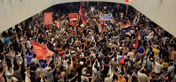 وقبل توجههم الى مجلس النواب، اجتمع عدد كبير من المتظاهرين في ساحة التحرير ثم توجهوا الى المنطقة الخضراء وجرى اقتحامها لاحقاً بعد اسقاط الكتل الكونكريتية.