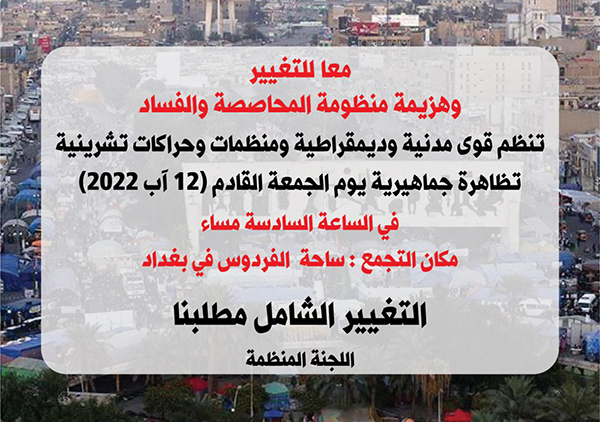 دعت قوى مدنية وديمقراطية واتحادات ونقابات الى تظاهرة جماهيرية في الساعة السادسة من مساء يوم غدٍ الجمعة 12 اب في ساحة الفردوس وسط بغداد.