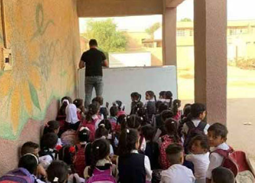وتناقلت وسائل إعلامية مختلفة يوم أمس صورا محزنة لطالبات صغيرات يفترشن الأرض خارج الصفوف، ويحاول المعلم أن يعطيهن الدرس، في مشهد يوضح حجم الخراب الذي حل بالتربية والتعليم.